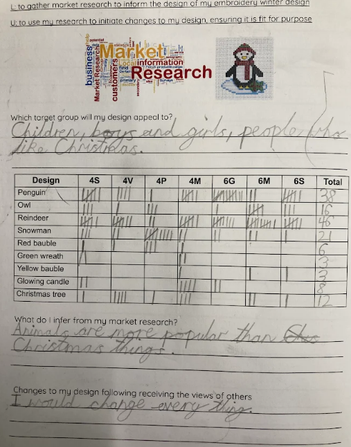 In Year 5 the children developed a prototype for a Winter Cross Stitch design. The children conducted market-research, asking children from different year groups what their preferred designs were. This allowed them to evaluate and refine their designs.