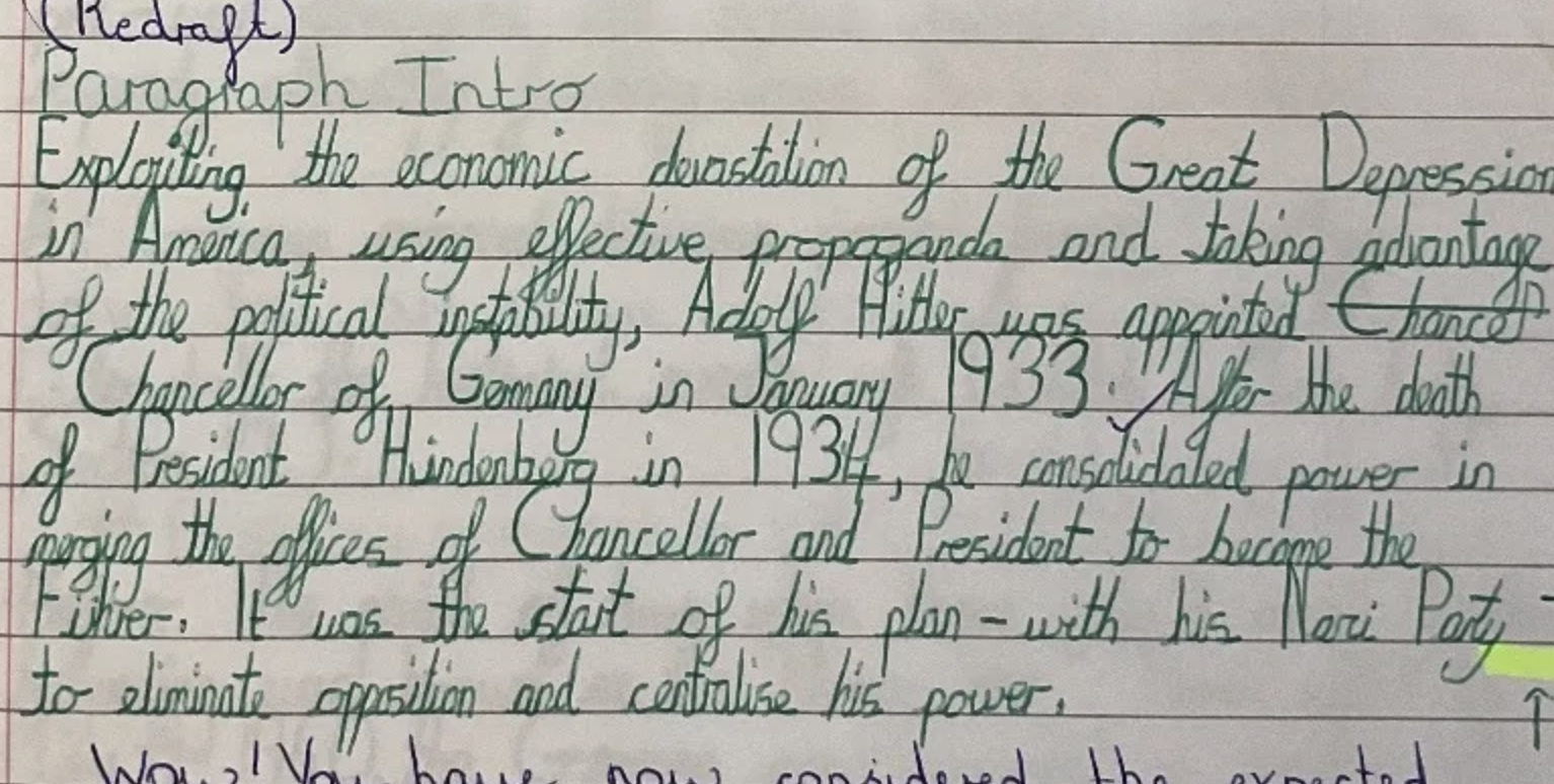 In Year 6, the children have redrafted a paragraph of their work to demonstrate the formal language that should be used in a factual recount. Initially the child wrote a paragraph in black pen and then redrafted it after conferencing with his teacher.