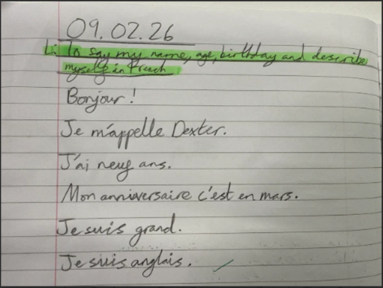 In Year 5, they have been exploring French this term and have made clear progress in basic spoken and written communication. Pupils have learned to count to 12 and state their age in French, use the months of the year accurately, and introduce themselves by giving their name, age, and birthday. They have also begun to describe themselves using simple adjectives, demonstrating an increasing understanding of sentence structure and pronunciation. As a writing outcome, pupils produced short self-introduction paragraphs in French, showing their ability to combine key vocabulary and simple phrases into coherent sentences with growing independence.