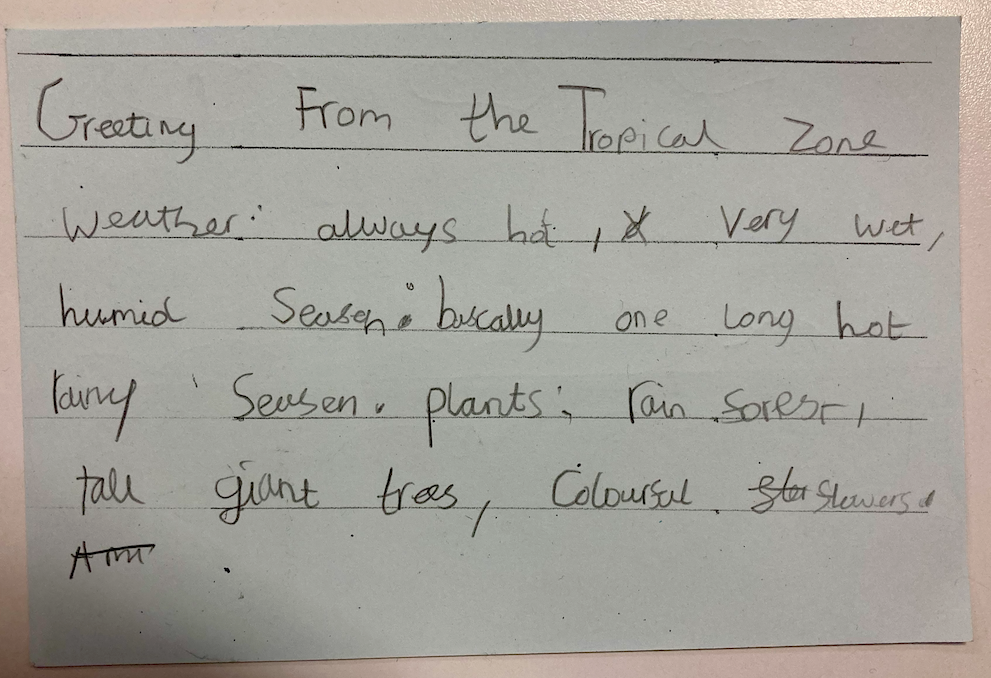 Year 4 have learned about climate zones and biomes this term. In order to apply their learning to a memorable context, the children were asked to write a postcard from a chosen climate zone (such as tropical, polar or temperate). Some children also wrote impressive information booklets that went into detail about the nature of a particular climate zone and biome.