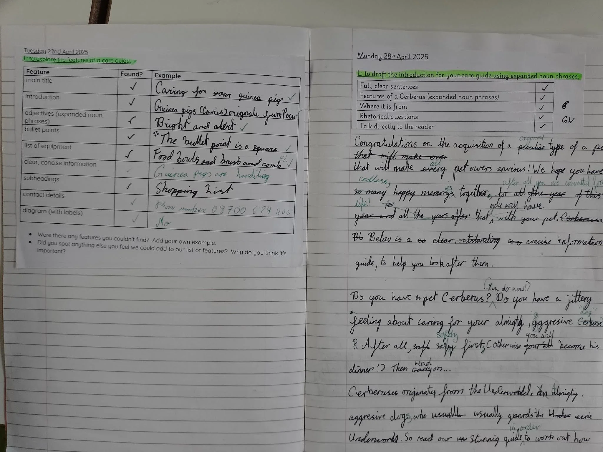 This is an exploration of features of a pet care guide. We then used our STS to compose our care guide for a Cerberus. This linked to our reading, where we researched Cerberus in the book Mythologica and online. A formal tone balanced with the humour in their piece was a mature task to be given.