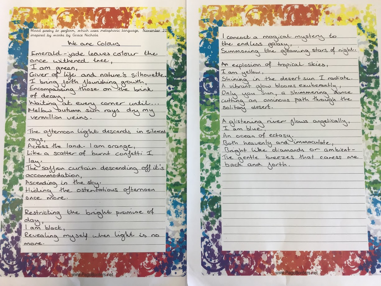 Y6 have been studying the poetry of the author Grace Nichols. They have developed their use of structure, layout and figurative language, focusing on the impact on their audience. This led to performing their poems. They developed skills in pace, tone and stage presence.
