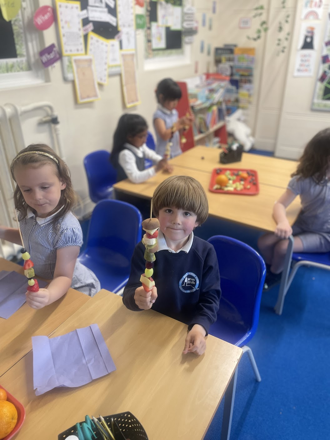 Year 1 have been designing fruit kebabs as part of their topic on ‘Carnival’. First, they learnt about healthy and unhealthy foods, including how to tell the difference between a fruit and a vegetable, and then they studied fruit to describe the look, texture, smell and taste. Finally, they made their fruit kebabs, choosing from a variety of fruits, considering which colours, textures and tastes would best compliment each other. Some children even made repeat patterns!