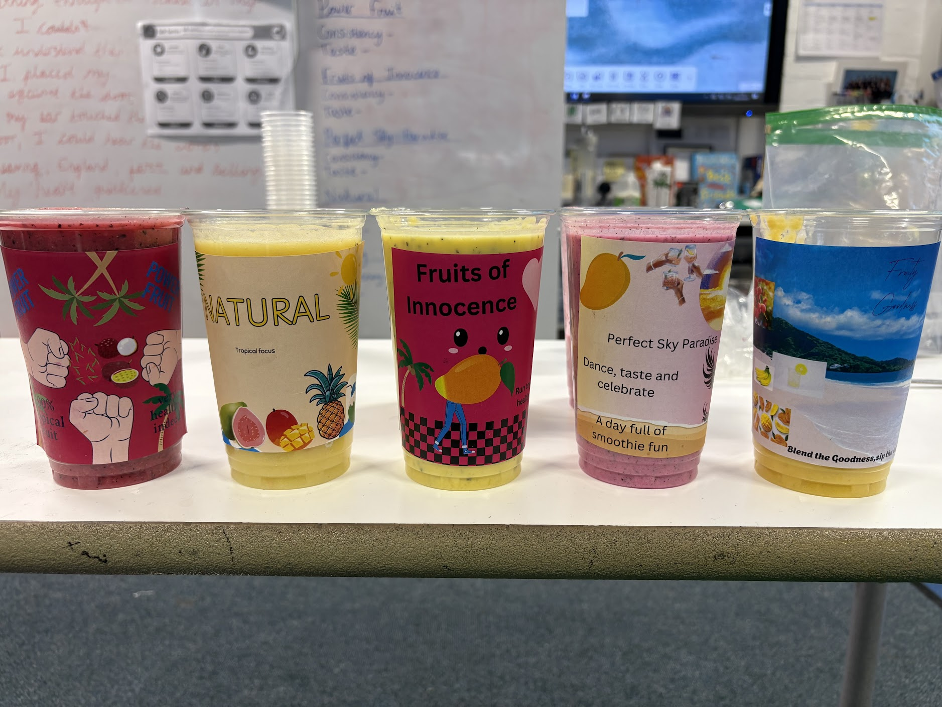 Year 4 designed and made their own Caribbean smoothies as part of their Dragon's Den Challenge. First, they completed taste testing and market research, identifying ingredients which they used to produce their own initial smoothie recipes. They made the smoothies, following their recipes, and tasted them to evaluate whether they needed any alterations. They also produced brand packaging, creating initial designs in groups and evaluating elements to take forward for their final designs. Their pitches included well explained design choices.